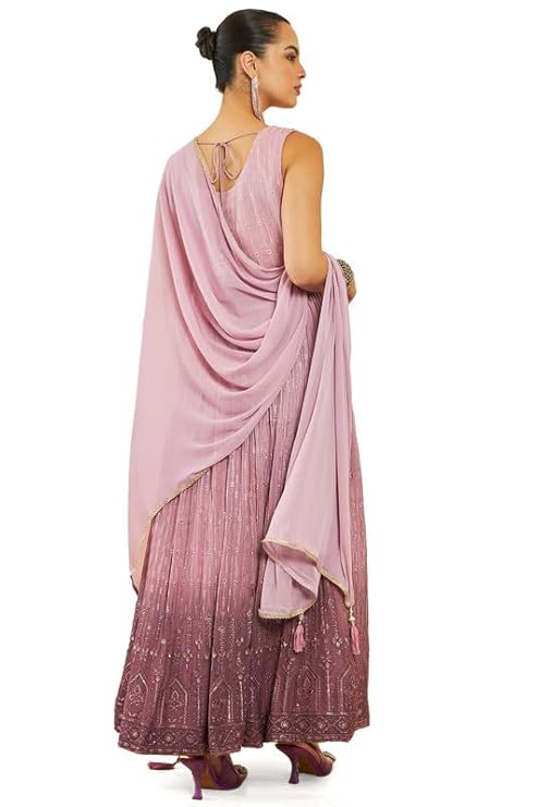 Meet our stunning pink ombre georgette gown, where fashion meets elegance. Crafted with exquisite embroidery and embellishments, it's sure to turn heads at any event. The gown showcases a graceful fade of pink hues from light to dark, giving it an ombre effect that's simply captivating. The sleeveless design with a round neckline is gathered at the waist, enhancing its style quotient. The neckline has zardosi embroidery on the neckline. To complete the ensemble, this gown is paired with matching leggings and dupatta for a truly dazzling affair.
